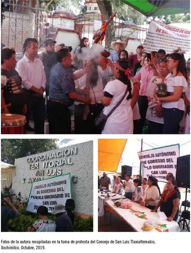 Durante el mes de diciembre de 2018 y enero de 2019 se realizaron los procesos de reposición de la convocatoria a la elección de los coordinadores territoriales en los 14 pueblos de Xochimilco, se llevaron a cabo las asambleas10 informativas para la elección de la autoridad local, comenzando en el pueblo originario de San Luis Tlaxialtemalco Xochimilco y, al igual que en los otros pueblos, se vivió un ambiente de tensión e intromisión por parte de la alcaldía en turno; sin embargo, en palabras de los propios integrantes del Concejo Autónomo de Gobierno, las autoridades de la alcaldía desestimaron la capacidad de organización del pueblo y lograron organizarse y discutir en Asamblea Comunitaria en el año 2019. En ella, la comunidad decidió que era mejor transitar hacia una figura colectiva como un Concejo Comunitario, integrado por un representante de cada barrio (11 integrantes en total) y así, el día 12 de enero del 2019 el pueblo de San Luis Tlaxialtemalco decidió en asamblea comunitaria, conforme a sistemas normativos propios y en el ejercicio de su derecho a la libre determinación, que su institución de gobierno sería un Concejo de Gobierno Autónomo, dejando atrás a la figura de Coordinador Territorial.